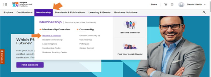 Basta clicar em “Log in” no canto superior direito sempre que quiser acessar o PMI. Uma vez logado, o próximo passo é se tornar um membro oficial. Para isso, vá na seção “Become a Member”, dentro da opção “Membership”: