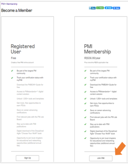 Ou seja, como forma de incentivar a adesão de profissionais ao instituto, o PMI trabalha com descontos nas certificações. Portanto, vale a pena se inscrever no PMI para fazer seu Exame de Certificação PMP! Então, basta clicar em “Join PMI”.