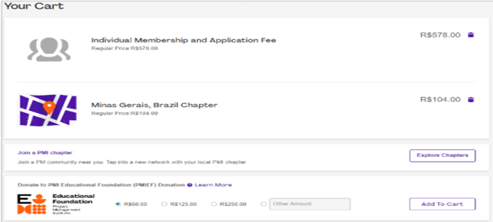 Você será direcionado para o seu carrinho, onde irá confirmar os itens que está adquirindo. O PMI já inclui para você a opção de aderir a um capítulo local. Caso entenda que seja interessante para você, basta deixar da forma como está. Caso queira descartar essa opção, basta clicar na lixeira ao lado dos valores. Aqui também você terá a opção de fazer uma doação ao PMI Educational Foundation (PMIEF), iniciativa do PMI para capacitar jovens no mundo do gerenciamento de projetos, permitindo que eles realizem todo o seu potencial. Mais uma vez, a escolha é sua sobre fazer a doação nesse momento ou não. Então, confirmando que está tudo ok com o carrinho, basta clicar no botão “Continue to Checkout”.