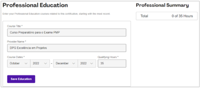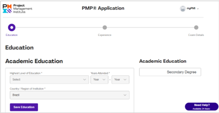 E aí você já cai no ciclo de informações que precisam ser enviadas para o PMI para que eles avaliem a sua aplicação. A primeira delas é sobre a sua formação acadêmica e sobra a sua educação formal em gerenciamento de projetos.