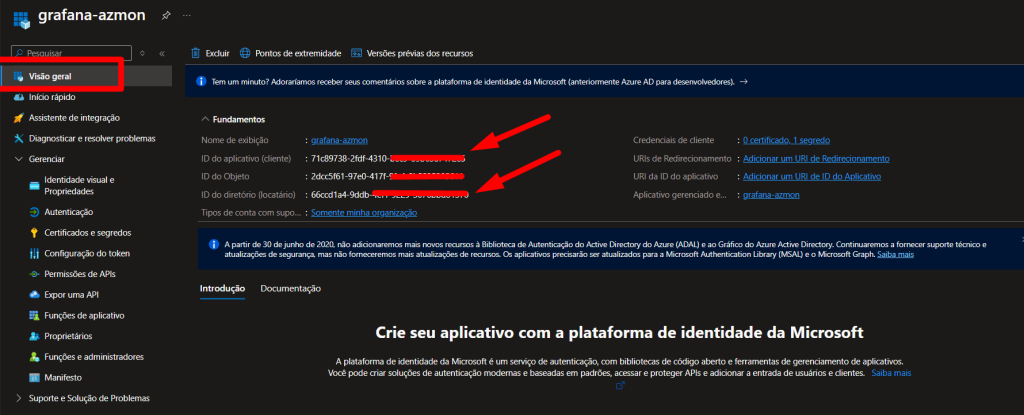 Após concluir o registro do aplicativo, acesse-o e, na seção Overview, anote as informações do ID do Aplicativo (Cliente) e ID do Diretório, pois elas serão necessárias para concluir a integração com o Grafana.