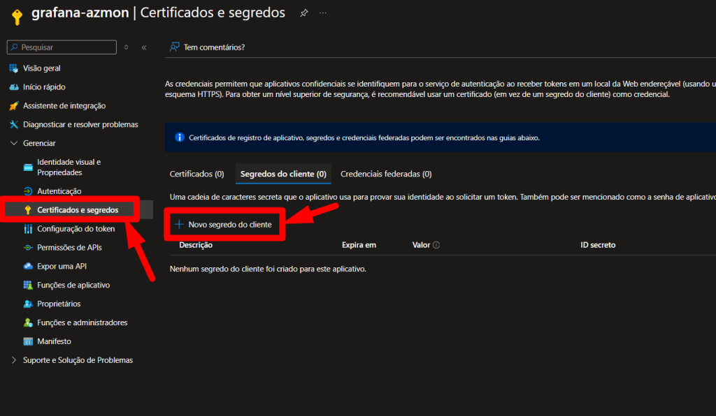 Acesse Certificados e Segredos e clique em Novo segredo do Cliente.