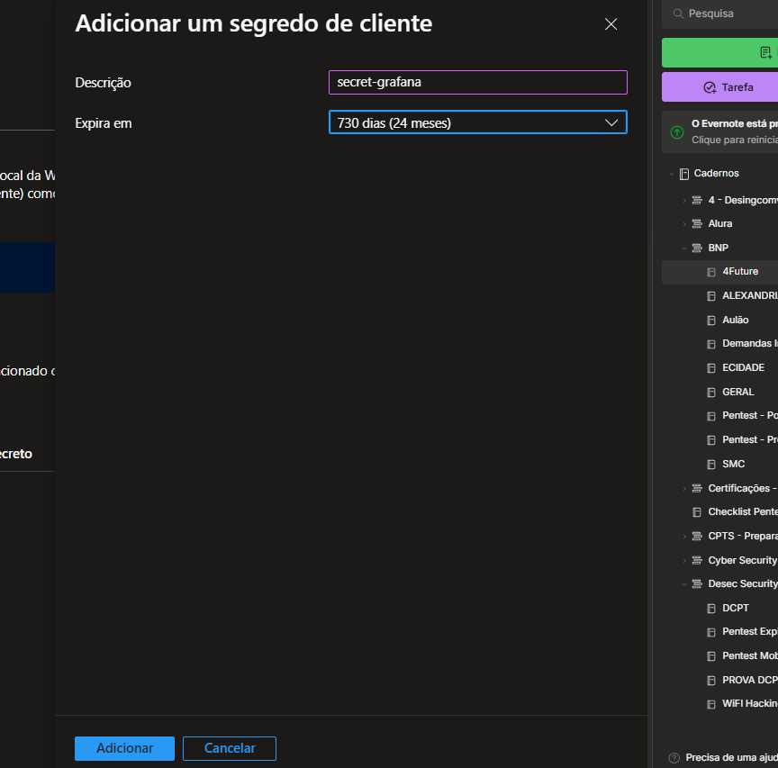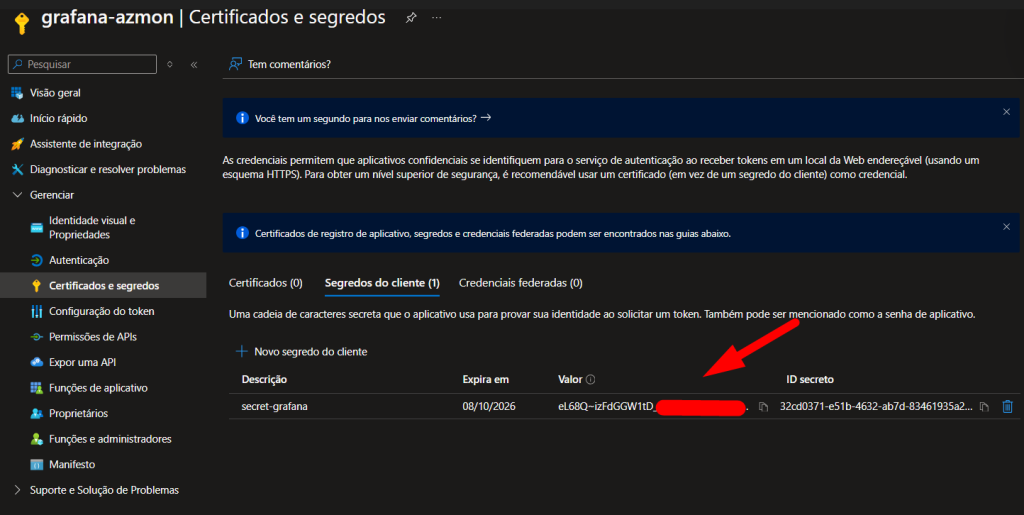 A secret criada dentro do App Registration no Microsoft Entra ID atua como uma credencial, permitindo a autenticação segura entre o Grafana e o Azure. Ela funcionará como uma ‘senha’ para o aplicativo.