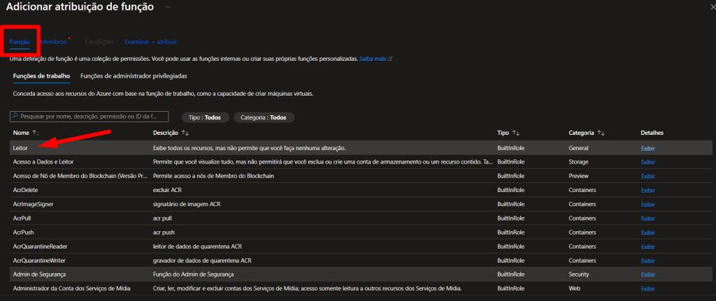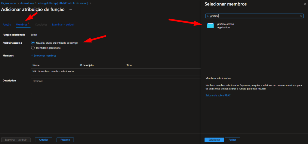 Na aba Função, selecione as permissões que o aplicativo precisará para executar sua função. Neste exemplo, a função Leitor será suficiente, pois o Grafana apenas precisará ler os dados para criar os dashboards.