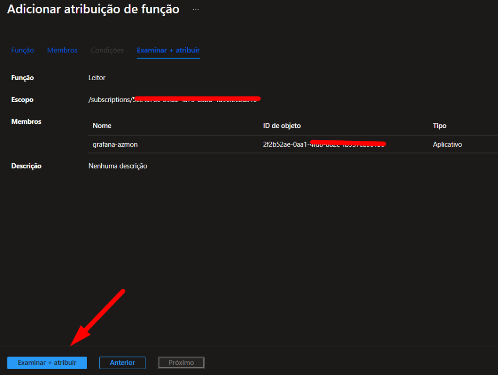 Agora, vamos conceder as permissões ao aplicativo criado para o recurso ao qual nosso Grafana precisa ter acesso. Neste exemplo, vou liberar as permissões para toda a minha assinatura.