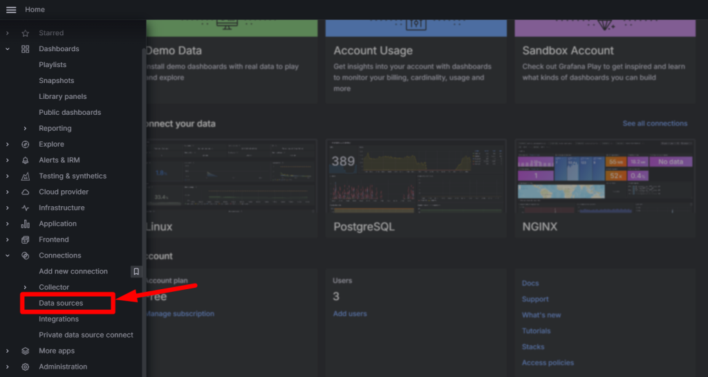 Após fazer login no Grafana, vá em Connections > Data Source.